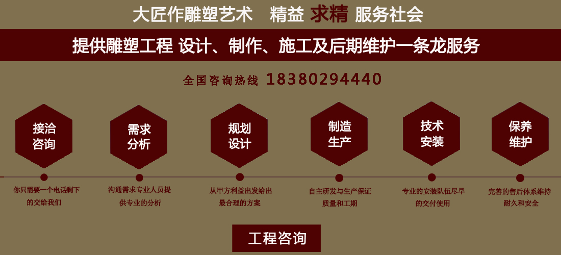 成都大匠作雕塑有限公司,是經成都工商局審定注冊的正規(guī)專業(yè)雕塑制作及工程安裝服務機構,是由一群年輕富有朝氣的年輕人創(chuàng)辦,發(fā)軔于四川省成都市龍泉驛區。它是一家******于創(chuàng)作、制作和銷售為一體的公司。大匠作擁有多年從事公共藝術的專業(yè)人員和雕塑制作人組成的核心團隊,為您提供專業(yè)、具創(chuàng)新的設計及制作服務。公司成立以來,秉承“******服務、誠信為本”的宗旨,以客戶需求為目標導向,不斷學習,進取,優(yōu)化和提高服務質量,公司向您******——“您的滿意***是我們的信譽”,我們將以飽滿的熱情和******的服務贏得您的贊譽和支持。 愛心,細心,耐心,責任心是我們的要求,盡心盡職,為您打造出創(chuàng)新、專業(yè)、******的設計方案,我們堅信先做人、后做事,用心對待客戶,實行透明收費,人性化服務,本著對客戶負責,對客戶負責,更是對自己發(fā)展負責的態(tài)度,爭取做到讓每位客戶滿意